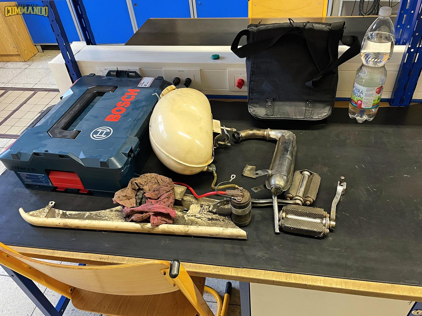 Motorka je komplet, probíhá úklid nářadí a přípravků |